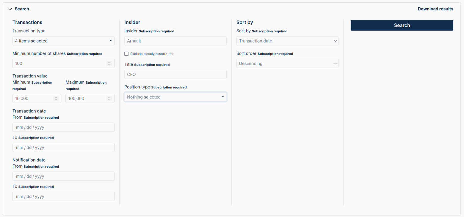 Feat/Possibility to filter by transaction typeto Feat/Possibility to filter by other values than only company 3 years agoThis is an example of search filters on insider screener: